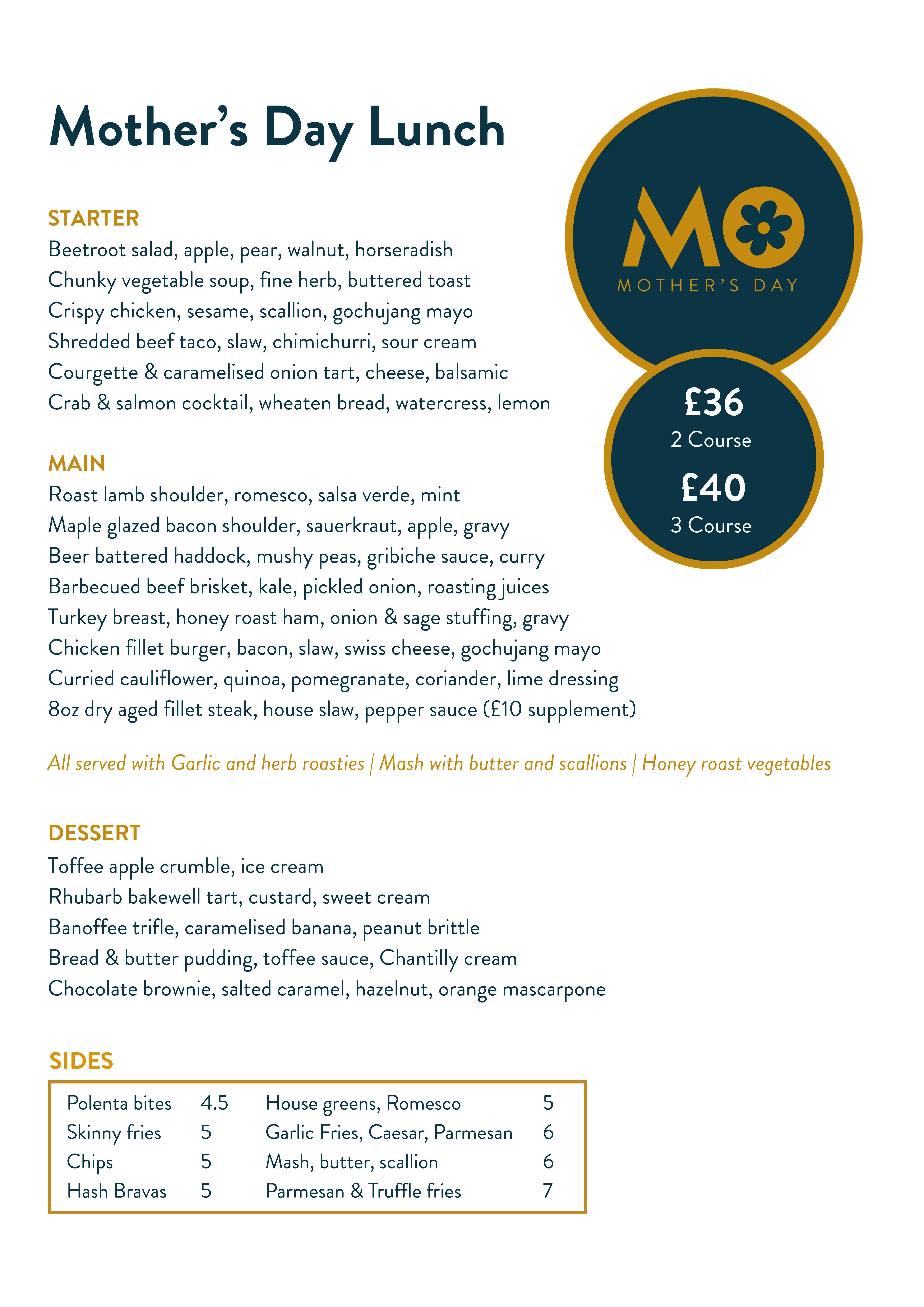 Join us for our delicious 2 or 3 course Mother's Day Menu on Sunday 15th March, 1pm - 7.30pm (last sitting).